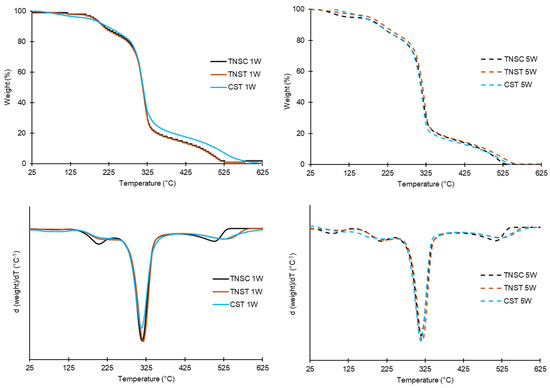 DTGA curves of films based on starch from horchata solid residue obtained by casting (TNSC) and thermal processing (TNST) methods or corn starch films made by thermal processing (CST) at 1 week (1W) and 5 weeks (5W) of storage.