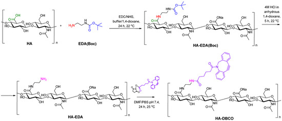 In order to introduce the DBCO moiety into the HA structure, HA was first modified with N-Boc-ethylenediamine (EDA(Boc)) (Figure 1). For this, the carboxyl groups of HA were pre-activated using the EDC/NHS system. Conjugation of amines to carboxyl groups using the EDC/NHS activation is a widely used method for the efficient formation of amide bonds [54].