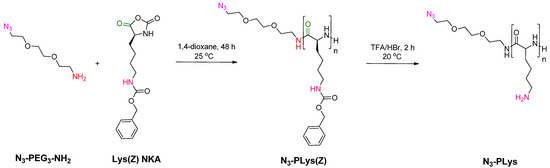 N3-PLys was synthesized using ring-opening polymerization (ROP) of Lys(Z) NCA and N3-PEG3-NH2 as an initiator and further removal of Z-protective groups. Synthesis of homopolypeptides by ROP with terminal functionality provided by a primary amine-containing functional molecule is well known [33,58,59]. In our case, the reaction was carried out in anhydrous 1,4-dioxane for 48 h using [M]/[I] = 30. The used initiator contained a primary amino group, which launches ROP of NCA under normal (amine) mechanism of polymerization (Figure 2). As a result, the final polypeptide contains an azido group in the terminal position, which is necessary for the SPAAC grafting reaction.