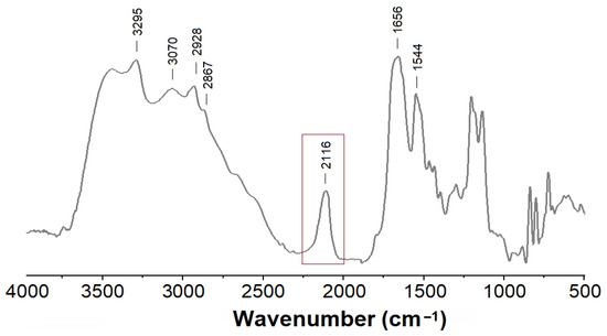 The structure of the resulting polypeptide was confirmed using 1H NMR spectroscopy (Supplementary Materials, Figure S4). The degree of polymerization (DP) was determined by comparing the average integral intensities of the methylene protons of -O-CH2-C6H5 group (δ = 4.94–4.97 ppm) and -CH2-NH- group (δ = 2.91–2.95 ppm) in PLys(Z) to the integral intensity of methylene protons of -CH2-NH- group in the initiator (δ = 3.34–3.36 ppm). The calculated DP was found to be 29. SEC analysis revealed a number average molecular weight (Mn) of 7150 and dispersity (Đ) of 1.23 for the resulting N3-PLys(Z). The DP value calculated from Mn determined by SEC was 27, which is consistent with the NMR data. The disappearance of the benzyl protecting group signals (4.98 ppm, -O-CH2-C6H5 and 7.2–7.3 ppm, -C6H5) in the 1H NMR spectra of PLys after deblocking indicates complete deprotection of the polypeptide (Supplementary Materials, Figure S5). To confirm the presence of the azide functionality in the resulting polypeptide, the sample was analyzed using FTIR spectroscopy (Figure 3). In the FTIR spectrum, the characteristic bands at 3295 and 3070 cm−1 correspond to the -NH and NH3+ stretching vibrations in the peptide bond and side chains of PLys, respectively. The bands at 2928 and 2867 cm−1 are attributed to the -CH2 stretching vibrations in the side chain of PLys. The absorption bands at 1656 and 1544 cm−1 are characteristic of the amide I and amide II. A band at 2116 cm−1 corresponds to the stretching vibration of the azido group. Thus, the used approach allowed the successful introduction of azide functionality into PLys at the polymerization step.