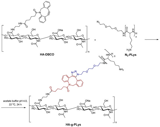 Scheme of the HA-g-PLys synthesis by SPAAC of HA-DBCO and N3-PLys.