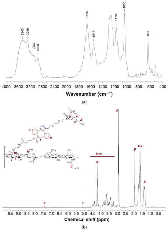 In the FTIR spectrum of HA-g-PLys, the signals of both HA and PLys are clearly detected (Figure 5a) [65,66]. Specifically, the characteristic bands at 3440, 3295, and 3067 cm−1 correspond to hydrogen-bonded -OH and -NH groups in HA and PLys, -NH stretching vibrations in the N-acetyl group and peptide bonds of PLys as well as -NH3+ groups in the side chains of PLys, respectively. The signal at 2948 cm−1 can be attributed to the -C-H stretching vibrations in both HA and PLys. The absorption bands at 1655 and 1548 cm−1 are characteristic of the amide I and amide II in PLys. At the same time, the bands at 1170, 1030, and 640 cm−1 belong to asymmetrical stretching vibrations of the -C-O-C- group (O-bridge), stretching vibrations of the -C-O- group, and out-of-plane bending vibrations of the -O-H group in HA, respectively. Furthermore, the disappearance of the band corresponding to the azido group, present in N3-PLys, confirms the success of the click reaction.