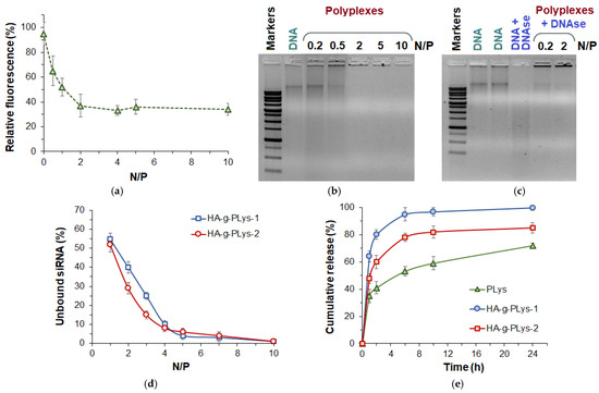 EtBr assay (a) and agarose gel electrophoresis (b,c) results demonstrating the efficiency of DNA binding by copolymer at various N/P ratios (a,b) and stability in the presence of polyplexes (c). CybrGreen I assay results demonstrating the presence of unbound dT-dA (as physicochemical model of siRNA) at different N/P ratios (d) and cumulative release of Fam-dT18 from polyplexes with HA-g-PLys and PLys (0.01 M PBS/DMEM + FCS = 50/50, 37 °C) (e).