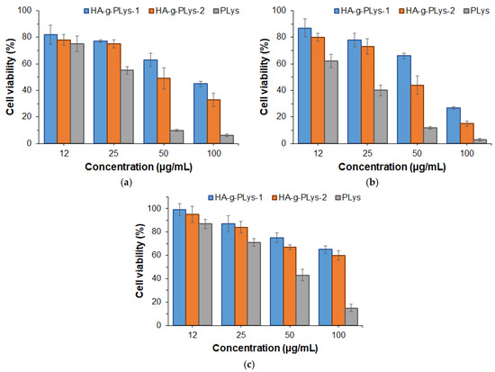 BEAS-2B, A549, and HEK-293 cells were used to evaluate the cytotoxicity of the HA-g-PLys nanoparticles. The CellTiterBlue (CTB) assay, based on the ability of living cells to convert resazurin into fluorescent resorufin, was used for the study. Cells were seeded into wells of a 96-well plate at a concentration of 8000 cells/100 μL of medium. After 24 h of incubation under humidified conditions (5% CO2, 37 °C), the medium was removed, and the dispersions of nanoparticles in culture medium at concentrations of 100, 50, 25, 12.5, 6.25 μg/mL were added to the wells with adhered cells. After incubating the cells with nanoparticles for 24 h, the medium was aspirated, and 100 μL of CTB solution in medium (medium to CTB ratio 10:1) was added to each well. Cells were incubated at 37 °C for 1 h, and the fluorescence (λex = 544 nm, λem = 590 nm) was measured by a Fluoroscan Ascent plate reader(Thermo Fisher Scientific, Waltham, MA, USA). Cells incubated without the tested nanoparticles were used as a negative (blank) control. The viability of cells in the presence of tested nanoparticles was calculated with respect to the control using the following equation: