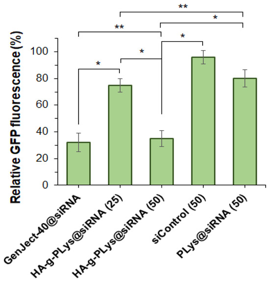 The efficiency of siRNA binding to the polymer was analyzed using the SybrGreen I binding assay [53]. With this aim, the freshly prepared solutions of HA-g-PLys@siRNA polyplexes (90 µL), containing 6 pmol siRNA per well at selected N/P ratios, were placed in the wells of a 96-well flat-bottomed plate. The plate was incubated at 22 °C for 30 min, and then 10 µL of 100× SybrGreen I solution was added to each well. After that, the fluorescence intensity was measured at wavelengths λex/em = 497/520 nm using a fluorescent plate reader. The unbound siRNA amount (%) is proportional to relative fluorescence calculated using Equation (1), but for fluorescence measured for free SybrGreen I (Fo) and SybrGreen I in the presence of free siRNA (FsiRNA) or the polyplex (F).