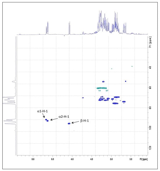 The structural characteristics of the mushroom samples were further examined by NMR spectroscopy, with emphasis on α- and β-anomeric protons. Figure 1 displays the 1H and 13C HSQC spectra of POL, being the spectra from the other PO samples overlapped. The α-anomeric protons H-1 appeared as doublets in the 5.1–5.2 ppm, while the β-anomeric proton H-1 was observed between 4.2 and 4.6 ppm. These assignments were based on distinct chemical shifts and their correlations with the glucose C1 carbon signals in the HSQC spectra—specifically, 92–94 ppm for α-C1 and 96 ppm for C1—as well as coupling constants J = 3.8 and 7.9 Hz, respectively. The assignments were further validated through COSY spectral analysis [,].