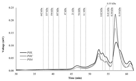 Molecular weight (MW) distribution of polysaccharide profile by size exclusion chromatography (SEC) of POL, POC, and POA Pleurotus ostreatus species.