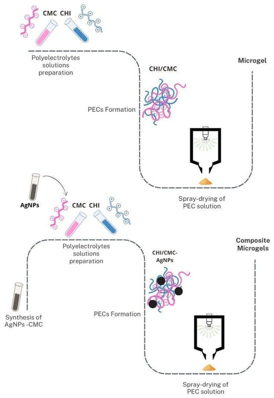 To obtain CHI/CMC microgels loaded with AgNPs-CMC in powder form, 10 or 20 mL of colloidal AgNPs-CMC suspension was added to a CMC solution, bringing its final volume to 100 mL (15 mg/mL CMC, resulting in a 10:100 or 20:100 ratio, respectively). The resulting microgels, incorporating either 10 mL or 20 mL of the AgNPs-CMC suspension, were subsequently referred to as CHI/CMC-10AgNPs and CHI/CMC-20AgNPs, respectively. This CMC solution was prepared by dissolving the polymer in a sodium bicarbonate/acetic acid 1% v/v buffer solution (pH 3.5), as detailed in Section 2.2. Subsequently, the CMC polymer solution containing AgNPs-CMC was mixed with the CHI solution to form PEC gels, following the procedure in Section 2.2. The resulting powder microgels (CHI/CMC-10AgNPs and CHI/CMC-20AgNPs) were then prepared by spray drying, using the same parameters described in Section 2.2. The reaction yield was estimated using Equation (1). The synthesis process for CHI/CMC, CHI/CMC-10AgNPs, and CHI/CMC-20AgNPs microgels is schematized in Figure 1.