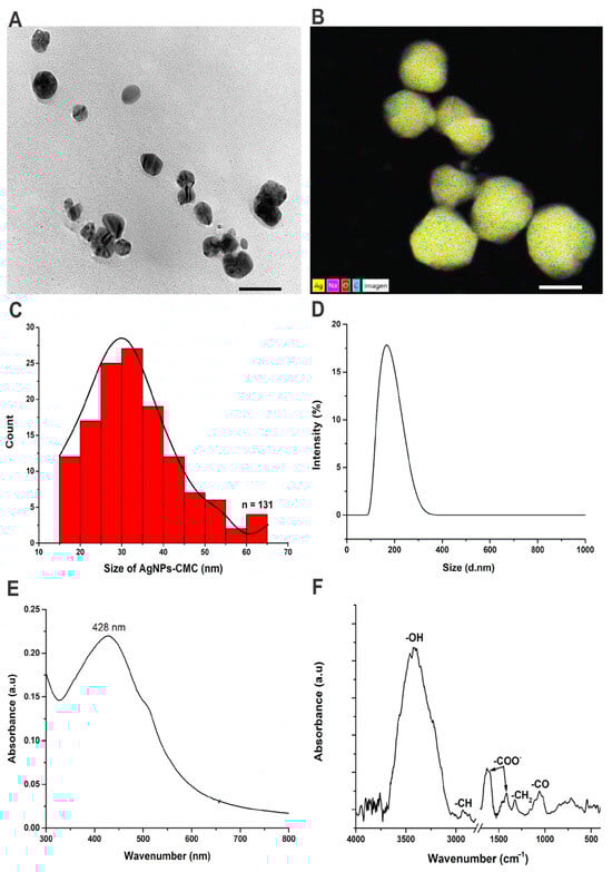 AgNPs-CMC characterization. (A) TEM image, scale bar 50 nm; (B) TEM image with chemical composition verified by EDS (Ag: yellow; Na: magenta; O: red; C: sky blue), scale bar 20 nm; (C) frequency histogram of size distribution determined by TEM images; (D) intensity distribution profile determined by DLS; (E) UV-vis and (F) FTIR spectra.