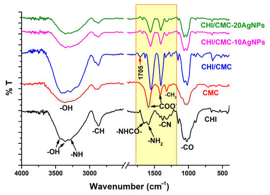 ATR-FTIR spectra obtained by pure CHI (black), pure CMC (red), CHI/CMC microgels (blue), CHI/CMC-10AgNPs (magenta), and CHI/CMC-20AgNPs (green). Principal functional groups are indicated. Light-yellow shaded region indicates interaction zone between CHI and CMC to form microgels.