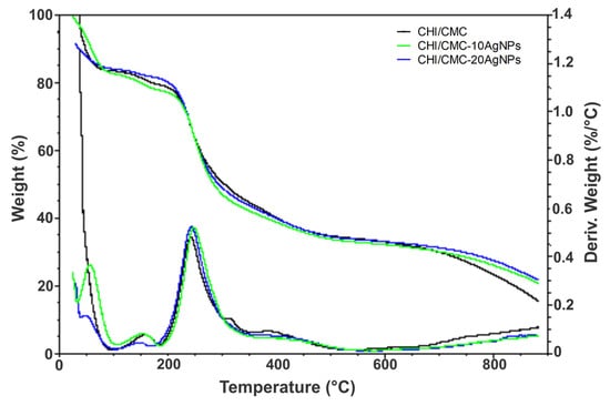 To determine the mass loss from CHI/CMC and CHI/CMC-AgNPs microgels exposed to different temperature conditions over a period of time, TGA was carried out using Q500-V20 equipment (TA Instruments, New Castle, DE, USA). Approximately 10 mg of each sample was processed, placed under the N2 atmosphere in order to avoid thermal oxidation, and heated at a rate of 10 °C/min from room temperature up to 900 °C.
