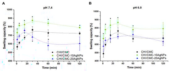 The swelling capacity was evaluated at pH = 7.4 to simulate the physiological conditions of plasma and blood and at pH = 6.0 because this is the typical pH of skin wounds [41].