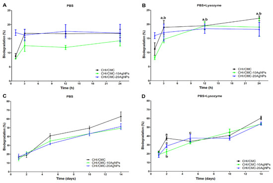 Biodegradation of microgels: (A) between 1 and 24 h in PBS, (B) between 1 and 24 h in PBS with lysozyme, (C) between 1 and 14 days in PBS, and (D) between 1 and 14 days in PBS with lysozyme. a indicates significant differences between CHI/CMC in PBS and CHI/CMC in PBS+lysozyme; b indicates significant differences between CHI/CMC-10AgNPs in PBS and CHI/CMC-10AgNPs in PBS+lysozyme; c indicates significant differences between CHI/CMC-20AgNPs in PBS and CHI/CMC-20AgNPs in PBS+lysozyme (p < 0.05).