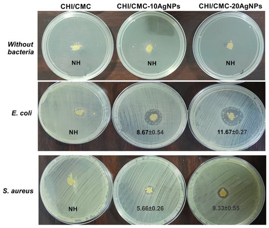 Prior to determining the antimicrobial activity, the sterility of the powdered microgels was verified. To assess potential microbial contamination, samples of CHI/CMC, CHI/CMC-10AgNPs, and CHI/CMC-20AgNPs were plated onto Mueller–Hinton agar (MHA) without the addition of bacteria and incubated at 35 ± 2 °C for 24 h. The absence of bacterial growth confirmed the sterility of the samples.