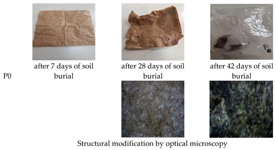 The biodegradation capacity (ASTM D5988-12) was assessed by quantitatively measuring the amount of CO2 released [mg] and by determining the mass difference [%] of the samples before and after burial in soil for 7, 14, 28, and 42 days, exposing them to the natural microbial activity present in the soil [37,38]. All paper samples subjected to biodegradation by soil burial were subsequently examined for physical degradation and comparatively analyzed in terms of appearance, both macroscopically (by direct visual inspection) and microscopically (using a DELTA Optical Three-Ocular Microscope-model SZ-450T® purchased from Delta Optical, Minsk Mazowiecki, Poland), thus providing a qualitative assessment of their biodegradation capacity.