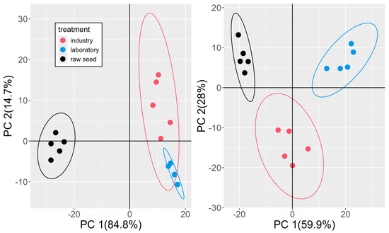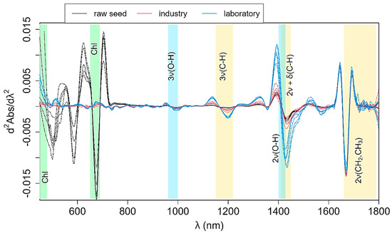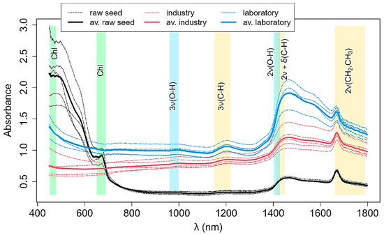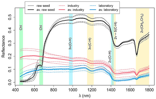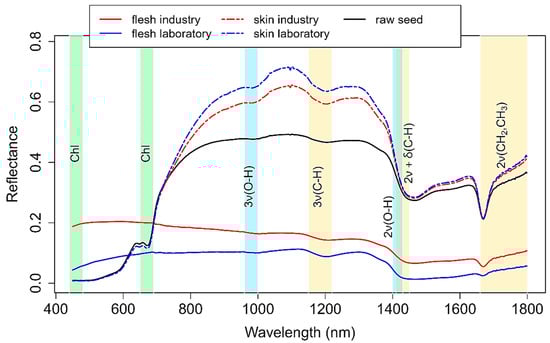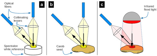 The carob tree (Ceratonia siliqua L.) is receiving growing attention for its agro-industrial potential, particularly due to its seeds, which are the source of locust bean gum (LBG), a galactomannan-rich polysaccharide with wide applications in food and pharmaceutical industries. Efficient dehusking of carob seeds is critical to maximize LBG purity and yield, yet current industrial methods pose environmental concerns and lack robust quality control tools. In this study, we demonstrate the use of Diffuse Reflectance Spectroscopy (DRS) and Kubelka–Munk (KM) modeling as a rapid, non-destructive technique to assess dehusking efficiency. By combining spectral data from four complementary spectrometers (450–1800 nm), we identified key reflectance and absorbance features capable of distinguishing raw, industrially treated, and laboratory-dehusked seeds. Notably, our laboratory-treated seeds exhibited a considerably lower reflectance in the NIR plateau (800–1400 nm) compared to raw and industry-treated seeds, and their KM-reconstructed skin showed enhanced absorption bands at 960, 1200, and 1400 nm, consistent with more complete husk removal and improved light penetration. Principal Component Analysis revealed tighter clustering and lower variability in lab-processed seeds, indicating superior process reproducibility. These results establish DRS as a scalable, green analytical tool to support quality control and optimization in carob processing. Full article