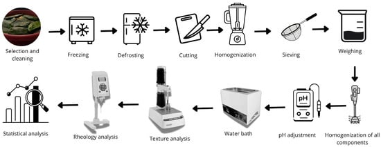 The forage palm cladodes were manually selected and any signs of damage were discarded. The selected cladodes were then washed with potable water to remove surface impurities and sanitized in NaClO (200 ppm) solution for 15 min. To remove residual chlorine, they were rinsed with potable water. The gloquides were manually removed with a knife, after which the cladodes were packaged in high-density polyethylene bags and stored in a freezer (Consul, Joinville, Brazil) at −18 °C until further use. An overview of the dispersion preparation and evaluation process is presented in Figure 1.