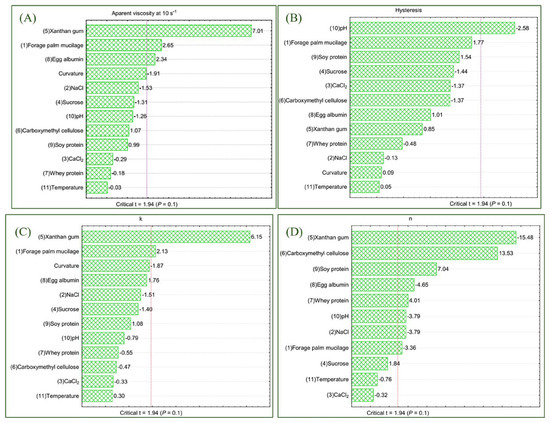 Estimated effects for the independent variables on the apparent viscosity at 10 s−1 (A), hysteresis (B), k—consistency index (C) and n—flow behavior index (D) represented by the Pareto chart. Legend: Calcium chloride (NaCl2), sodium chloride (NaCl).