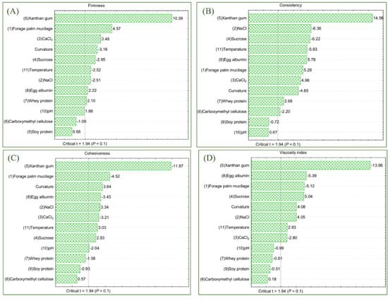 Cohesiveness and viscosity index. The cohesiveness data ranged from 0.047 to 0.167 N, exhibiting a similar trend as observed for firmness. The greatest effect was observed with XG (0.064 N; p < 0.001) and FPM (0.025 N; p = 0.004). Egg albumin also had a notable impact on dispersion cohesiveness, with an effect of 0.019 N (p = 0.014), followed by calcium chloride (0.017 N; p = 0.018). A significant negative effect with sodium chloride (−0.018 N·s; p = 0.016), indicating that excessive levels of this monovalent salt reduced dispersion cohesiveness. Figure 4C illustrates the standardized effects of the independent variables temperature, sucrose, and pH, all of which also had a significant impact, although to a lesser extent. Furthermore, the standardized effect of curvatures suggests that the study ranges for the independent variables were appropriately defined.