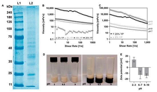 Yeast protein (YP) insulates characterization. (A) Molecular weight distribution of YP through sodium dodecyl sulfate polyacrylamide gel electrophoresis (SDS-PAGE). L1 represents the size marker and L2 represents YP. (B + C) Viscosity vs. shear rate curves of YP at different (B) concentrations and (C) pH conditions. (D) Images of 8% (w/v) YP solutions at different pH conditions. (E) Zeta-potential of YP at different pH conditions.