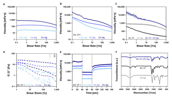 Alginate (Alg) and Yeast protein (YP) bioink characterization. (A–C) Viscosity vs. shear rate curves of (A) Alg at different concentrations (B) 8% (w/v) YP blends with Alg at different concentrations, and (C) YP, Alg, and their blend. (D) Strain sweeps curves and (E) three-iteration thixotropy test of 8% (w/v) YP blends with Alg at different concentrations. (F) FTIR spectra of YP, Alg, and their blend.