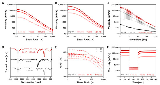 Characterization of xanthan gum (XG) and yeast protein (YP) bioink. (A–C) Viscosity vs. shear rate for: (A) XG at varying concentrations, (B) 8% (w/v) YP with varying XG concentrations, and (C) YP, XG, and their blend. (D) FTIR spectra of YP, XG, and their blend. (E) Strain sweeps and (F) three-cycle thixotropy tests of 8% (w/v) YP with varying XG concentrations.