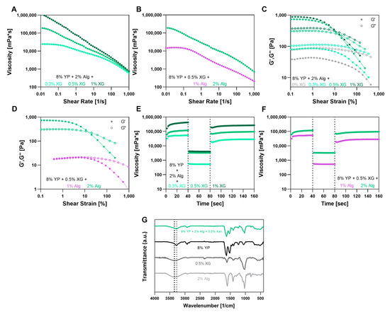 Alginate (Alg), Xanthan gum (XG) and Yeast protein (YP) triple bioink characterization. (A,B) Viscosity vs. shear rate curves of triple blends at different (A) XG concentrations and (B) Alg concentrations. (C,D) Strain sweep curves of triple blends at different (C) XG concentrations and (D) Alg concentrations. (E,F) Three-cycle thixotropy tests of triple blends at different (E) XG concentrations and (F) Alg concentrations. (G) FTIR spectra of Alg, XG, YP and the triple blend.