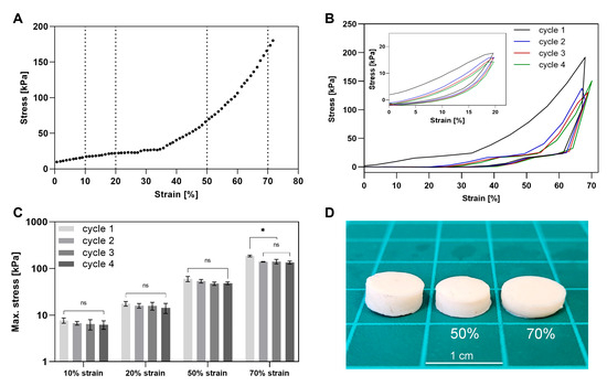 Cyclic compression test of crosslinked hydrogels. (A) Representative stress–strain curve of a hydrogel under non-cyclic compression up to 70% strain. (B) Stress–strain curves from 4-cycle compression tests at 20% and 70% strain. (C) Maximum stress per cycle during cyclic compression at 10%, 20%, 50%, and 70% strain. (D) Image of gel before compression and after four cycles of 50% or 70% compression. * refer to the statistically significant differences of p < 0.05, and ns to not significant.