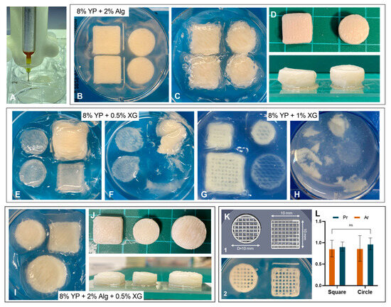 Embedded 3D printing of edible bioinks. (A) Printing process demonstration within CarGrow. (B–D) 8% (w/v) YP + 2% (w/v) Alg blend: (B,C) images of printed structures after printing, and (D) images of printed objects post-extraction with top and side views. (E–H) 8% (w/v) YP + XG blends: images of (E) 0.5% (w/v) and (G) 1% (w/v) XG within CarGrow after printing. Images of (F) 0.5% (w/v) and (H) 1% (w/v) XG within CarGrow after extraction. (I,J) The triple blends composed of 8% (w/v) YP + 2% (w/v) Alg + 0.5% (w/v) XG (I) within CarGrow support bed and (J) Post-extraction with top and side views. (K) Designed and printed grid structures (square and circular). (L) Ratios of printed-to-designed pore perimeter (Pr) and pore area (Ar) for both geometries.