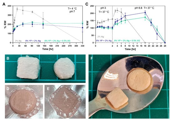 Stability was also tested under simulated pH conditions of the gastrointestinal tract (Figure 8C). Crosslinked hydrogels were first incubated in PBS mimicking the pH conditions of gastric fluids at pH 3 and 37 °C for 2 h, then transferred to pH 6.8 PBS mimicking the pH conditions of intestinal fluids (the buffers content is detailed in Section S4 of the Supplementary Material). As shown in previous studies, Alg gels swell slightly in gastric fluid (pH 3) and more significantly in intestinal fluid (pH 7) [62,63]. This pH-responsive behavior makes them suitable for protecting compounds intended for intestinal release, such as proteins [64], drugs [65], and supplements [62,66]. During the gastric pH phase, the Alg gel swelled by ~1.5×, while the YP–containing gels remained nearly unchanged. Upon transition to intestinal pH conditions, the Alg gel swelled to 200% of its original weight within 2 h and fully dissolved by 18 h. The YP–Alg and YP–Alg–XG gels showed slower swelling, reaching 200% and 150% after 19 h, respectively, and dissolved more gradually, within 28 h. Similarly, freeze-dried RGD-modified Alg scaffolds containing plant proteins (soy and pea protein) showed slower degradation and lower weight loss in PBS at 37 °C compared to protein-free scaffolds [19], supporting our findings that protein incorporation enhances gel stability under physiological conditions.