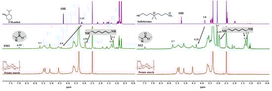 1HNMR spectra of commercial potato starch (red), menthol (purple-left) and sulfobetaine (purple-right), and the modified starch with menthol SM1 (green-left), and with sulfobetaine SS2 (green-right).