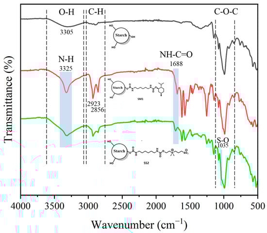 The FTIR analysis is shown in Figure 3, where the potato starch (black) spectrum exhibits a wide band in the 3000–3600 cm−1 range that corresponds to the stretching vibration of the hydroxyl group. The vibration bands at 2923 cm−1, 1412 cm−1 and 1242 cm−1 correspond to the carbon-hydrogen (C-H), carbon-carbon (C-C) and the deformation of the methyl group (C-H) bonds of the methylene groups, respectively. The absorption bands at 1362 cm−1 and 1465 cm−1 are attributed to the plane O-H bending vibration in the glucose unit and 931 cm−1 to the O-H out-of-plane bending vibration [25]. Other characteristic bands were observed at 1640 cm−1, indicating the presence of bonded water, and 1145, 1075 and 996 cm−1 were associated with the stretching vibration of the C-O bond, C-O-H and C-O-C groups in the anhydrous glucose ring, respectively. Additionally, in the infrared spectra of the modified starch (SM1—red, and SS2—green), a band corresponding to the carbonyl groups due to the urethane motifs (NH-C=O) appears at 1688 cm–1, while the band corresponding to their amine groups (N-H) appears at 3325 cm–1. In addition, the presence of the sulfobetaine group is noted in the SS2 spectrum by a sharp band at 1035 cm–1, characteristic of the SO3- motifs.