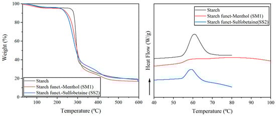 Starch suffers gelatinization in excess water, in which an irreversible reaction occurs, destabilizing the hydrogen bonds of the amorphous regions, leading to the loss of their crystallinity and modification. The DSC analysis (Figure 4—right) showed a gelatinization curve of the native potato starch between 55–70 °C, with a maximum peak centered at 60.7 °C. Similarly, SS2, starch modified with sulfobetaine, showed a gelatinization process between 54–67 °C, centered at 59.0 °C. Choque-Quispe et al. [27] describe a similar behavior for another variety of potato starch: an initial temperature of 54.1 °C, a final temperature of 73.0 °C and a gelatinization peak of 61.8 °C. SS1, sulfobetaine modified starch, presented a comparable gelatinization profile with the peak centered at 59.0 °C. However, SM1, starch modified with menthol, exhibited a broad gelatinization process between 54–100 °C, which may be explained by the hydrophobic nature of the starch carrying menthol motifs may explain.