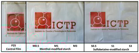 Samples were prepared in a lab micro-compounder Xplore MC15 HT (Xplore Instruments BV, Sittard, The Netherlands, 15 cm3 capacity). Potato starch with the corresponding (0–3 wt.%) amount of menthol-/sulfobetaine-modified starch (75 wt.% total) was manually mixed with 25 wt.% glycerol until a homogeneous mixture was achieved. The mixture was left overnight. The following day, the mixture was introduced into the extruder, which operated in recirculation mode to allow repeated processing and homogenization of the melt for 3 min. The co-rotating screw speed was set at 200 rpm, and the operating temperature was 110 °C. The resulting extrudate filament was pelletized. The pellets were introduced into the extruder operating in open mode, 110 °C and 100 rpm. Film extrusion was carried out using a 60 × 1 mm flat-sheet die attached directly to the extruder die. A total of 7 formulations were prepared: control film (P25), menthol-modified (M0.5, M1 and M3), and sulfobetaine-modified (S0.5, S1 and S3).