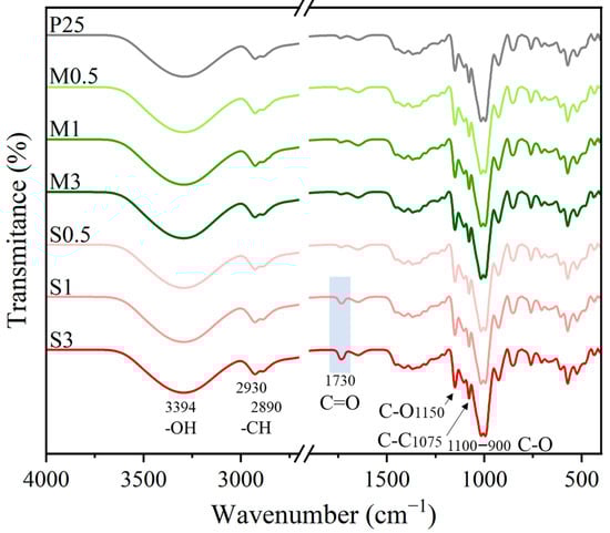 The FTIR spectra of the samples presented the characteristic signal bands of TPS consisting of: hydroxyl (O-H) stretching (3500–3100 cm−1), C–H stretching from alkyl groups (2930 cm−1and 2890 cm−1), C–O and C–C stretching (1150 cm−1 and 1075 cm−1, respectively), and C–O–H bending (1100–900 cm−1) [28]. The major difference is evident in the S-modified films, where a signal at 1730 cm−1, likely associated with the previously identified carbonyl groups at 1688 cm–1 in SS2, gradually increases with the SS2 concentration, as shown in Figure 7.