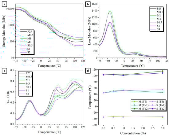 The temperatures at which the tan δ maxima are observed are related to the glass transitions or secondary transitions in the studied material. TPS systems typically exhibit a phase separation, due to the non-uniform distribution of plasticizer molecules in the film, resulting in the formation of plasticizer-rich and starch-rich domains [31]. All samples presented at least two distinct maxima in the loss modulus and tan δ, a narrow and high-intensity peak centered at −40 °C (Tβ), corresponding to the glycerol-rich phase, and a broad peak between 25–125 °C (Tα), corresponding to the starch-rich phase. Tβ generally occurs below 0 °C, owing to the low molecular weight and inherently low Tg temperature of plasticizers. In this phase, the mobility of starch chains is primarily dictated by localized motions of small molecular segments, primarily involving water and glycerol [32]. Since glycerol concentration is constant in all formulations (25 wt. %), incorporation of M-/S-modified starch results in minor variations, indicating that local molecular mobility remains largely unaffected by the modifications, as seen in Figure 8d.