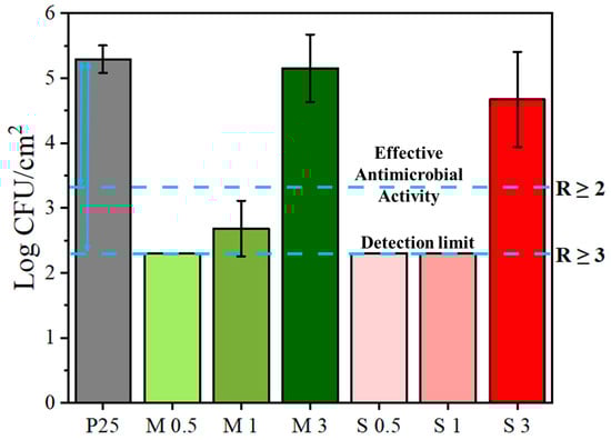 The control film (P25) showed an average bacterial recovery of log CFU/cm2 = 5.3 ± 0.2. Based on the detection threshold of the plating methodology used, the minimum quantifiable bacterial concentration was established at log 2.3. Consequently, samples from which no bacterial colonies were recovered (i.e., S0.5, S1, and M0.5) are reported with R values exceeding this threshold (R > 3.0), acknowledging that their true antibacterial activity may surpass the quantification limit of the assay.