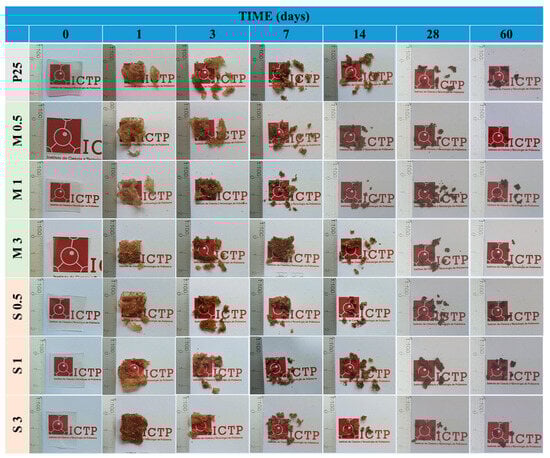 The biodegradable nature of TPS-based materials is one of the most outstanding qualities for packaging applications. The disintegrability of the films was assessed through the disintegration test following the ISO 20200 standard [24]. The test replicates, under lab-simulated circumstances, the heat (58 °C) and humidity (about 55% RH) typical of a commercial composting plant’s thermophilic phase. Figure 10 shows the disintegration profile of all the studied samples in terms of mass loss, whereas Figure 11 shows the visual evolution of the samples during the test. During the process, the films exhibit a sponge-like behavior, absorbing moisture from the compost and adhering sawdust to their surface. Moreover, the color of the films gradually changes from transparent to dark brown after prolonged contact with the dark compost soil.