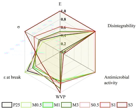 A comparative evaluation of the key properties of the films was conducted to assess their overall suitability for food packaging applications, as shown in Figure 12. To allow both visual and quantitative comparison among the different formulations, all measured parameters were normalized to a 0–1 scale and displayed in a radar plot. For properties where higher values indicate better performance (such as mechanical strength or antioxidant activity), direct normalization was used, while water vapor permeability (WVP) was inversely scaled, since lower values signify improved barrier effectiveness.