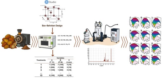 The cocoa industry generates large amounts of waste; in 2024, cocoa bean production was around 4.3 million tons [1]. Cocoa beans make up about 10% of the total weight of the fruit and are used to make chocolate [2]. The cocoa pod husk (CPH) is the main by-product of the cocoa industry, accounting for approximately 75% of the total weight of the fruit [3,4], with annual estimates of 48 million tons of CPH worldwide [5]. Management of these residues is costly and complex, and they generally remain on the land, causing foul odors, soil contamination, greenhouse gas emissions, and excessive growth of pathogenic fungi that cause diseases that affect crop production [6,7]. However, it is also an important and challenging renewable source for biorefining and has been the focus of research interest for several decades [8]. CPH is rich in biologically active molecules with nutraceutical properties, consisting of carbohydrates, lignin, proteins, lipids, pectin, minerals, theobromine, phenolic compounds, and tannins [4]. Sugars in CPH pectin include xylose, arabinose, rhamnose, galactose, mannose, glucose, and galacturonic acid, making it a good source for the food industry [9]. Hemicellulose is rich in xylose with neutral sugar substitutions and phenolic acid esters used in the food and pharmaceutical industries [10]. In this sense, CPH can be pretreated to separate its components such as lignin from cellulose and hemicellulose, and to obtain molecules from xylo-oligosaccharides [11]. There are several types of pre-treatment, including thermal, chemical, physical, biological, and combinations of these [12,13]. Microwave-assisted hydrothermal pretreatment (MA-HTP) is a pretreatment that combines microwave methodology with chemical reagents and is known to be more efficient than conventional heating [14]. This study proposes combining MA-HTP and 1H NMR without the use of chemical reagents as a novel method for extracting and quantifying mono- and disaccharides from CPH and HMC-CPH. Several studies have been reported on the extraction of pectin from CPH with MA-HTP in combination with strong acids, organic acids, enzymatic methods, etc. [2,6,15,16]; the results highlight the impact on time savings, which is why it is considered a green technology [10,17]. MAE has also been used in combination with strong acids to delignify lignocellulosic materials with maximum lignin removal [14]. The efficacy of MA-HTP can be assessed using a mathematical model that predicts the statistical significance of the dependent variables and their interactions, providing optimal conditions using tools that reduce the number of experiments [18], these are response surface analyses (RSAs), which allow the variables of an experiment to be optimized to optimize a response [2]. An example is the Box–Behnken design (BBD), a mathematical model with first- and second-order coefficients, which is a three-level incomplete factorial design for three factors [19]. The BBD is slightly more efficient than the central composite design and much more efficient than the three-level full factorial designs [18,20]. Therefore, MA-HTP in combination with RSA is a technique used to extract active compounds from plant materials, where the relationship between solvent, extraction time, and irradiation power is studied [21]. On the other hand, NMR has been successfully used as a quantitative method for natural products, as all components resonate at very low concentrations, just above the detection threshold (5–10 µM) [22]; it is also over 98% accurate and is therefore considered a reliable technique for quantitative estimation. This has been established through validation procedures for precision, accuracy, linearity, reproducibility, robustness, selectivity, and specificity. However, this is only true if the sampling and processing parameters are well-known [23]. 1H NMR spectra of carbohydrates have constant shifts concerning a reference because they are not affected by pH or ionic strength due to the absence of ionizable groups. Therefore, the acquisition parameters remain constant for each sample and a list of frequencies can be constructed [24]. To date, no publication proposes the extraction of mono- and disaccharides from CPH by MA-HTP using only water as an extraction medium, so it is feasible to seek the optimization of the process parameters, reducing time and cost using a statistical model. Therefore, the present study aims to optimize the conditions for the extraction of carbohydrates from CPH and HMC-CPH by MA-HTP, using DBB response surface analysis and 1H NMR quantification, to make a green pretreatment for this lignocellulosic material more efficient.