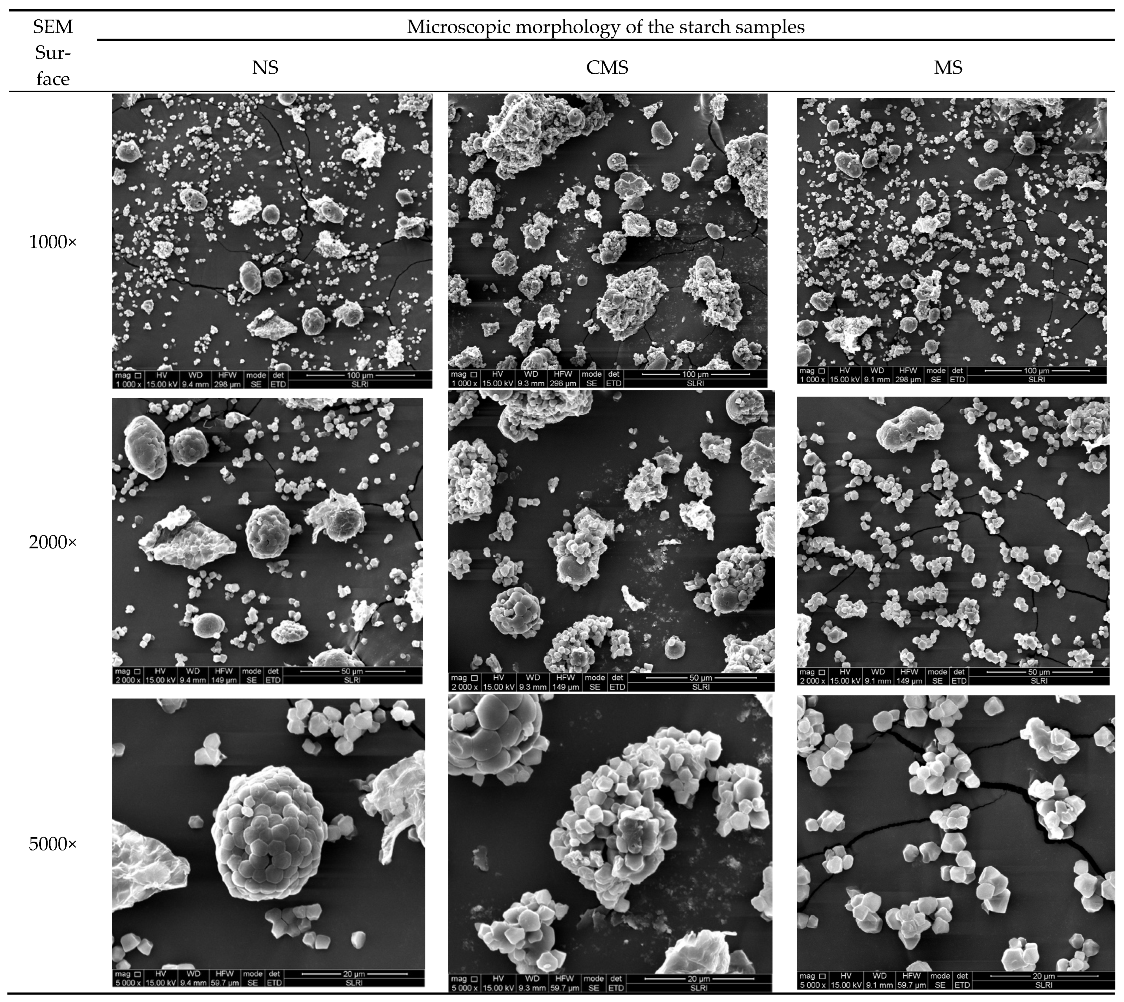 - Arueya, G.L.; Ojesanmi, A.A. Evaluation of Effects of Increasing Molar Substitution of Hydroxypropylene on Physicochemical, Functional and Morphological Properties of Starch from Water Yam (Dioscorea alata). J. Food Res. 2019, 8, 58. [Google Scholar] [CrossRef]