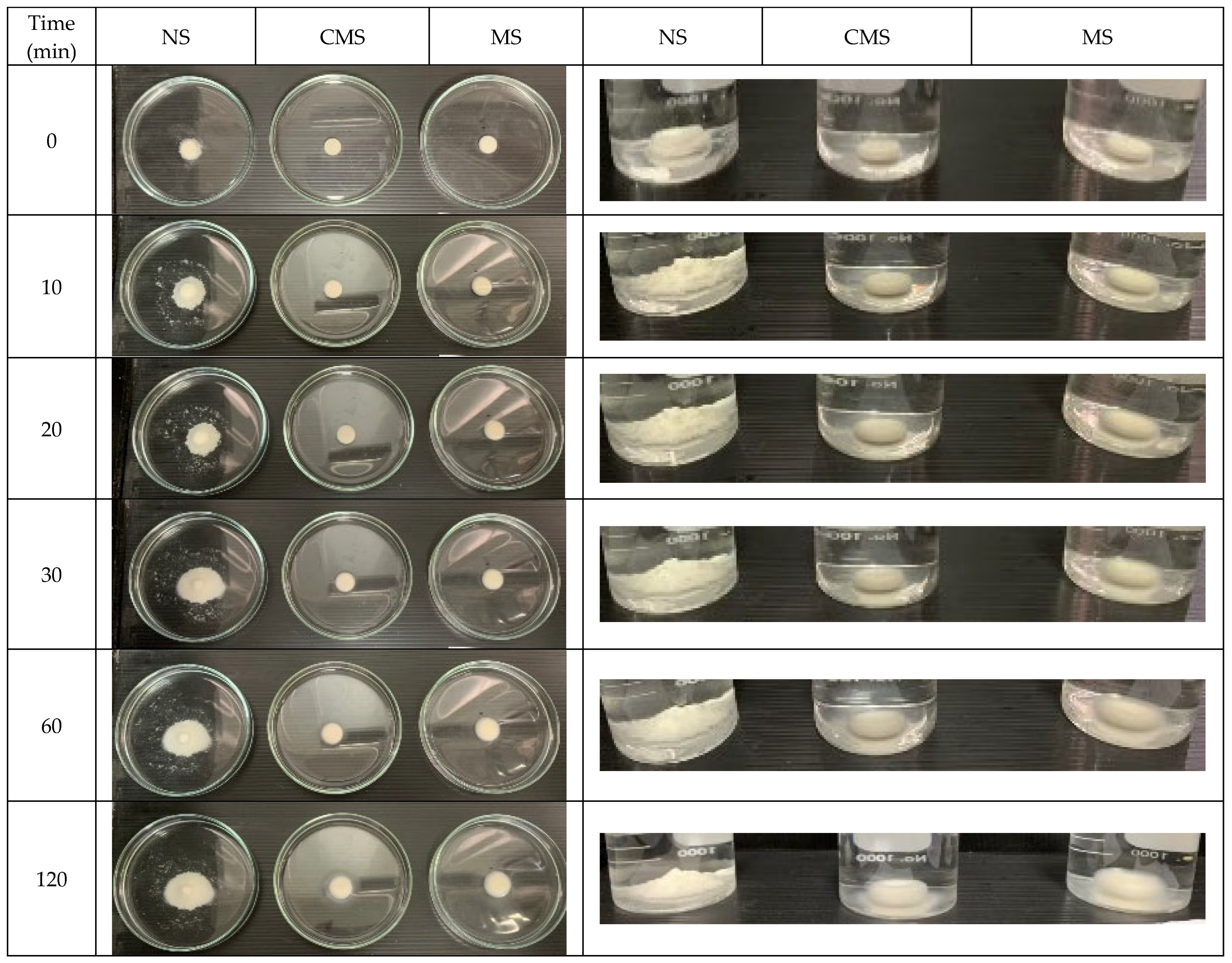 3.2.2. Characteristics of Swelling in Starch Tablet