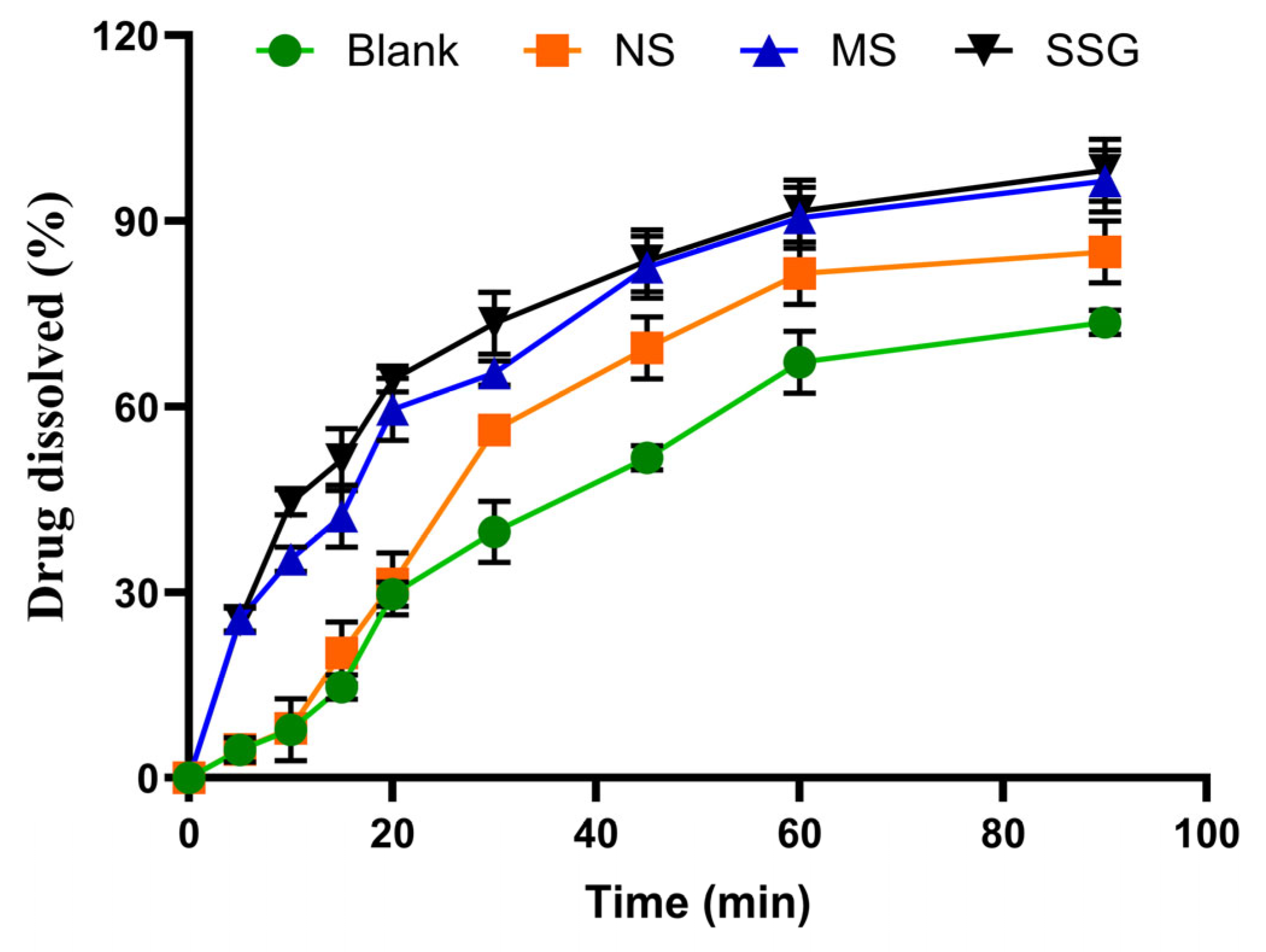| Disintegration time (s) | 60 ± 2.32 | 44.82 ± 5.67 | 9.42 ± 2.42 | 3.32 ± 1.14 |
