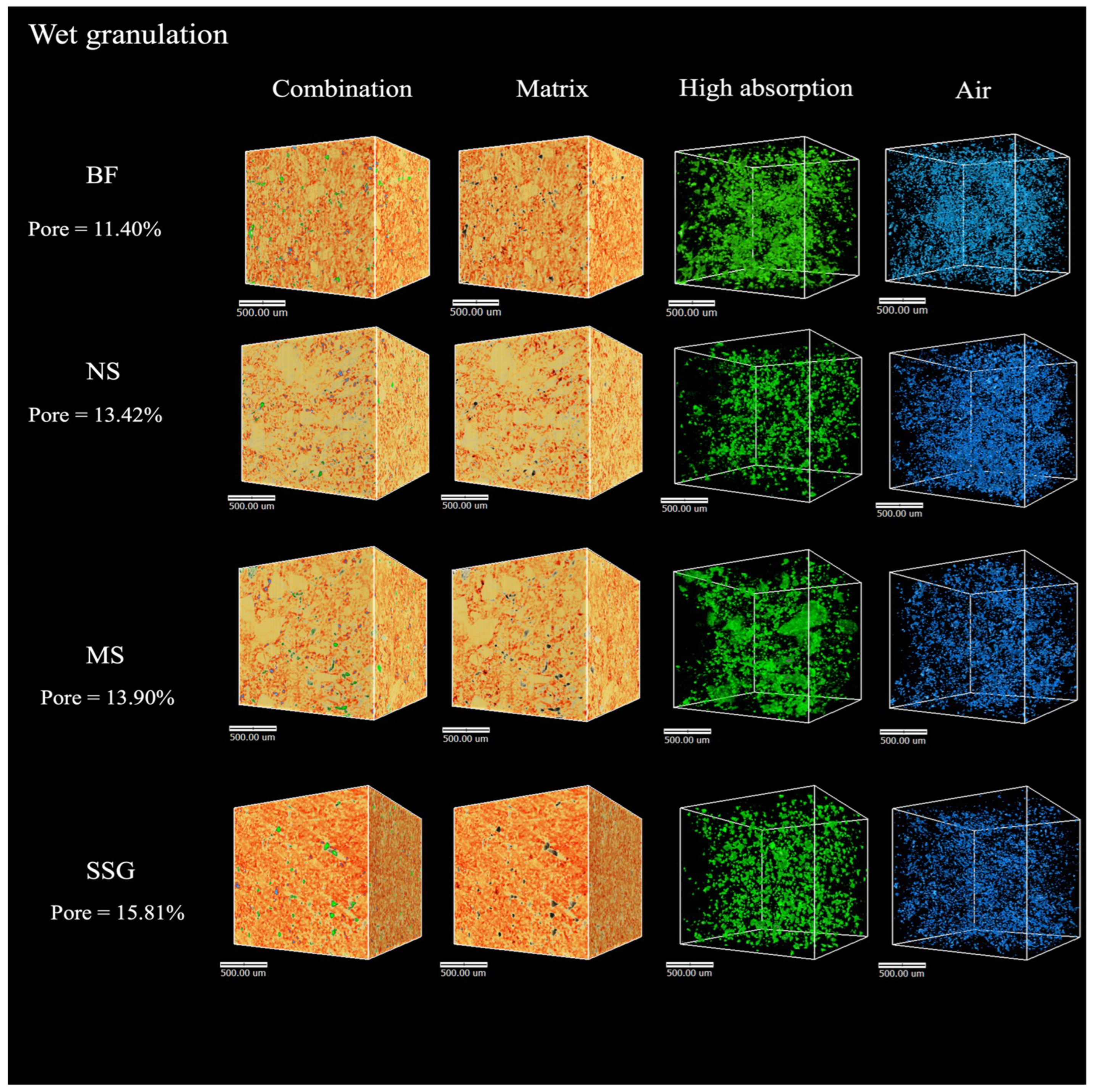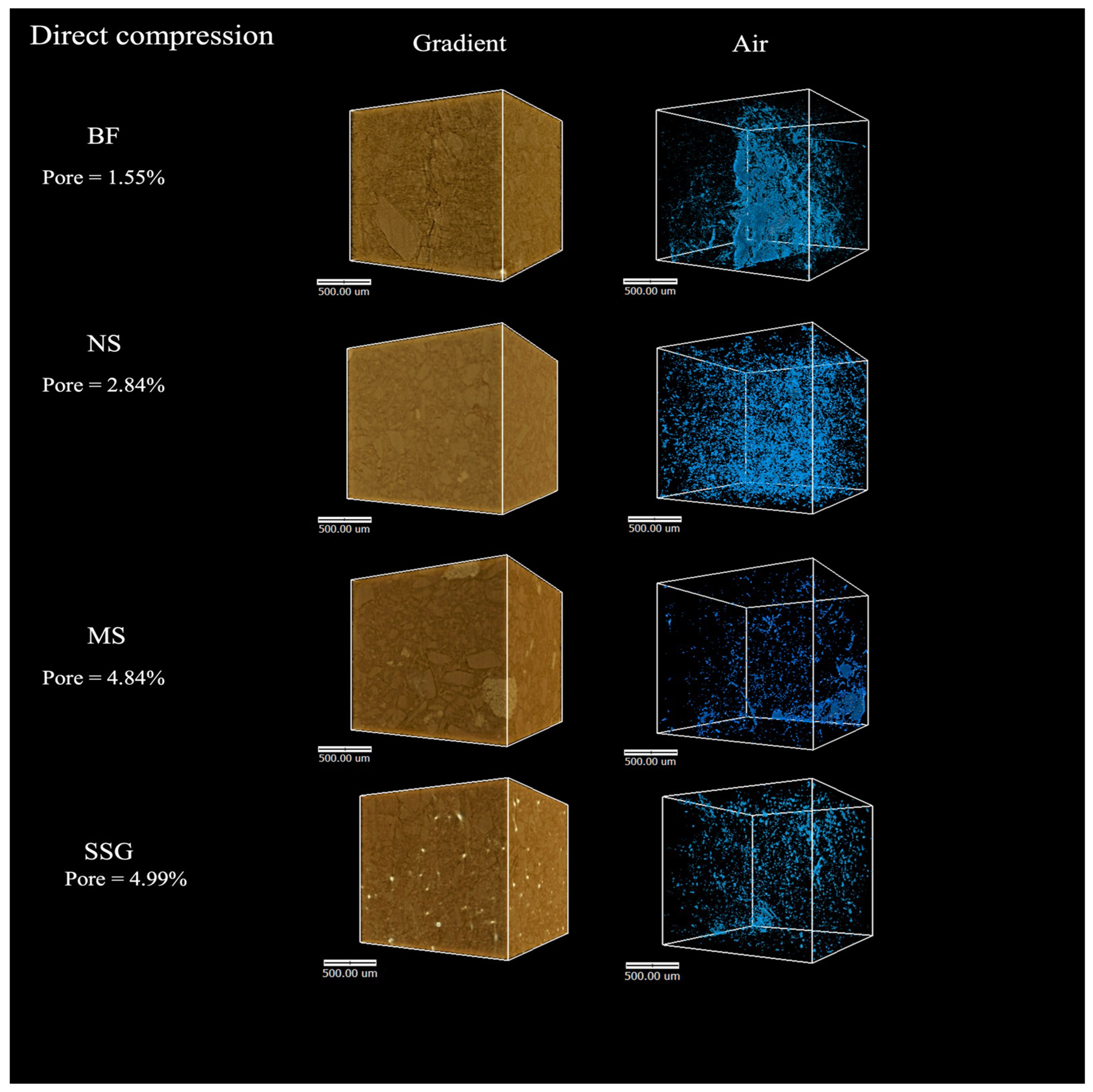 - Schomberg, A.K.; Diener, A.; Wünsch, I.; Finke, J.H.; Kwade, A. The Use of X-Ray Microtomography to Investigate the Microstructure of Pharmaceutical Tablets: Potentials and Comparison to Common Physical Methods. Int. J. Pharm. X 2021, 3, 100090. [Google Scholar] [CrossRef]