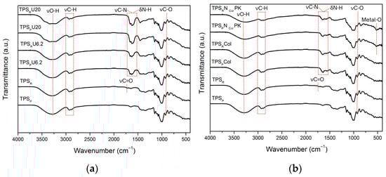 Figure 2 shows the FTIR spectra obtained for pure thermoplastic starch (TPSP) and modified thermoplastic starch (TPSR), along with the spectra of the polymeric materials developed by incorporating collagen and urea. In the spectra for all systems, characteristic bands of starch can be observed.