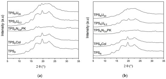 These spectral changes indicate that incorporating urea, collagen, and K2HPO4 into the TPS matrix results in chemical modifications, primarily through interactions with hydroxyl, carbonyl, and amine groups. The absence of the ester carbonyl stretching band at 1730 cm−1 indicates that urea reacts with citric acid, inhibiting esterification reactions and altering the chemical systems. Such insights are crucial for understanding the material behavior and tailoring the properties of TPS-based systems for specific applications. The crystallinity of the polymeric systems, both with and without citric acid, was evaluated through X-ray diffraction, with the corresponding diffractograms presented in Figure 3.