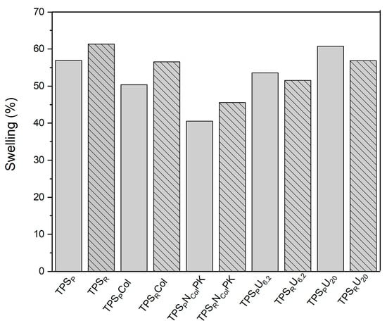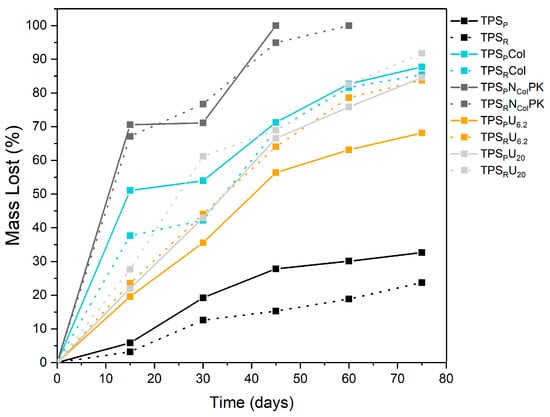 The results indicate that adding citric acid to the starch matrix slows down the degradation of the polymeric systems. It was observed that TPSP degraded at a mass loss rate approximately 10% higher compared to TPSR. Similarly, the collagen-based systems with the addition of citric acid, TPSRCol, and TPSRNColPK, exhibited slower degradation, with a lower percentage of mass loss over time compared to the TPSPCol and TPSPNColPK systems, which did not contain the compound. Adding carboxylic acid to the starch matrix did not slow down the degradation rate for the systems incorporating urea. It was observed that TPSRU6.2 and TPSRU20 degraded faster than TPSPU6.2 and TPSPU20. These results align with the FTIR characterization data, indicating that urea interferes with the esterification reaction.