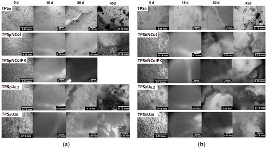 In the image of the polymeric systems before burial (0 days), all surfaces appeared rough, with a uniform texture across the entire surface. After the first removal (15 days), the systems exhibited surface erosion, with a smoother appearance. At the second removal (30 days), cracked areas and increased surface degradation were observed, particularly in the TPSR, TPSP, TPSPU6.2, TPSRU6.2, and TPSRNCol systems, which showed more prominent fissures, as displayed in the images. By the third removal (45 days), the TPSPNColPK system had completely degraded, while the other systems continued to show further progress in the degradation process, with an increase in cracks and surface deterioration. The presence of cracks and changes in surface texture are essential visual indicators in the degradation process. Since degradation involves the cleavage of polymer chains, it results in structural and physical alterations. FTIR analysis also helped confirm these structural changes, as shown in Figure A1. The images depict the progression of cracks formed throughout the analysis as the system degrades. Overall, the biodegradation of the polymeric systems was evident over the 45-day analysis period, with variations in degradation rates among the different types of systems.