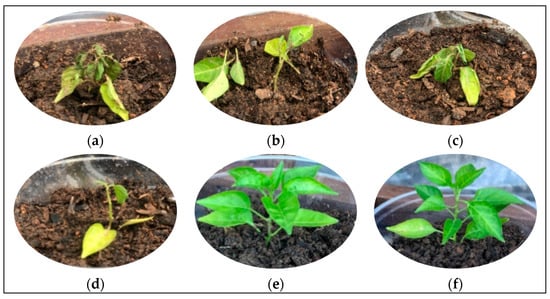 Photographs of pepper seedlings planted in soil containing: (a) 5 g of pure urea after 2 days of planting; (b) TPSPU20 and (c) TPSRU20 after 5 days of planting; (d) 0.30 g of pure urea after 4 days of planting; (e) TPSPU6.2 and (f) TPSRU6.2 after 15 days of planting.