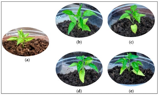 Photographs of pepper seedlings planted in soil after 45 days of cultivation: (a) without a polymeric system; (b) TPSPCol; (c) TPSRCol; (d) TPSPNColPK, and (e) TPSRNColPK.